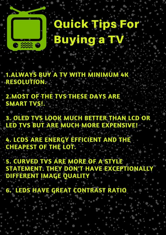 From black and white TVs to CRTs to LEDs and LCDs, buying a TV these days involves a lot of research. To save you the trouble of an extensive search, here is our TV buying guide. We have compiled a list of different TVs and their advantages to help you choose the best TV for you and your family.