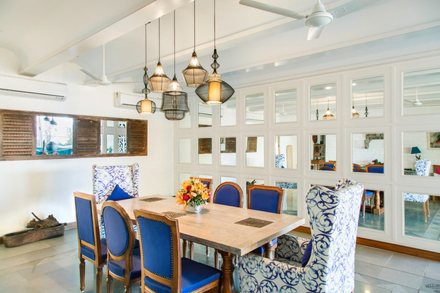 He confesses to a mirror fetish, and it can be clearly seen in his dining area, bathed in whites and blues. The blues are extended into his dining space as well. There’s a calming yet bohemian feel to this entire place. The dining room is more stately and formal, with a panelled wall inset with mirrors along one side. A hand carved console and lots of light soften the space, making it a royal yet warm place to enjoy a meal.