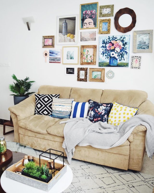 gorgeous Chennai home? We had spotted a standard gallery wall of photographs in black frames, laid out in a grid, in her living room. She recently re-did that wall and completely replaced it with an eclectic gallery wall full of artwork! Since we are on a mission to demystify