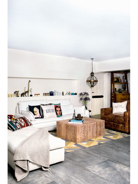 The living room is a cosy mix of New York loft and Swiss chalet, with white walls, comfortable sofas, concrete-tiled floors and expansive windows. Look how the fabrics and colour pops on the throw pillows are beautifully contrasting with the white sofa.
