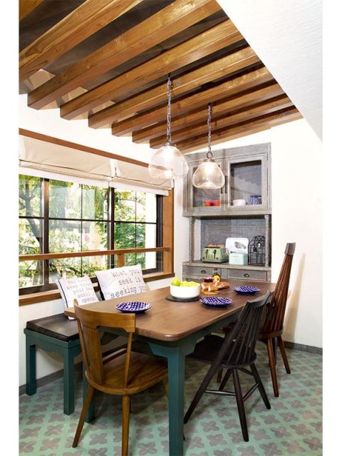 The dining area is giving the feels of a hillside cafe oozing cosiness with Swiss styled hanging lights and Roman windows. Notice how the dining seats are all in different shades yet well complemented.