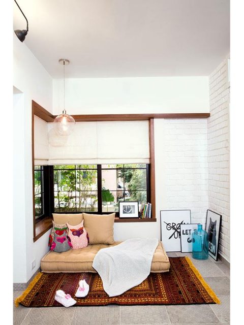 In one corner of the hall is this brightly lit reading space, on a harlequin patterned flooring. An impressive range of home decor here starting from a quirky lamp, a small terrarium and even those weighty books on history.
