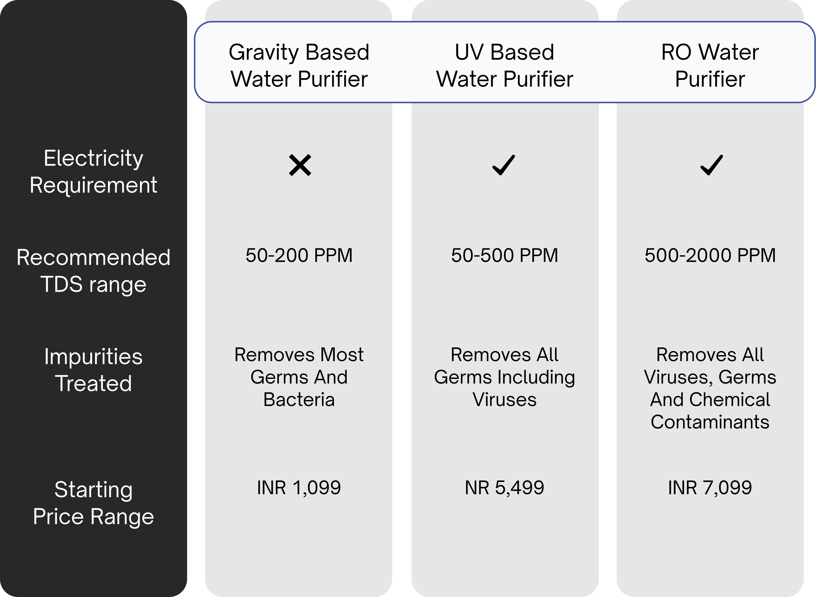 There are 3 types of water purifiers available.