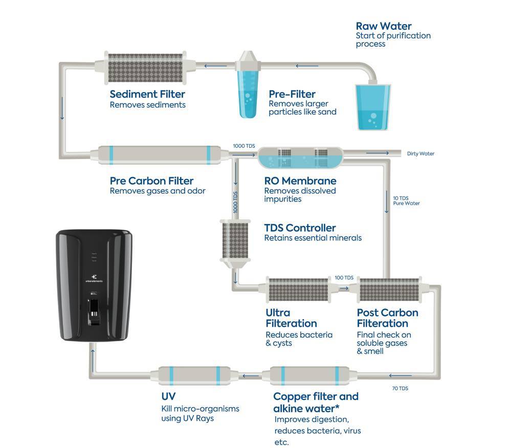 Stages of filtration determine the purification of your water. Common filtration stages are pre-filter, sediment filter, RO membrane, UV filter.